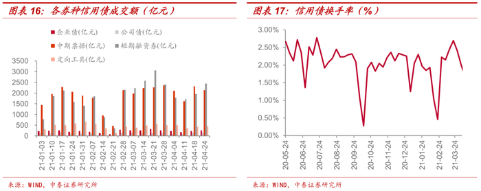 本周信用债市场成交活跃度小幅回升。本周信用债周度换手率为2.31%,较上周上升15bp。分券种看,企业债、公司债、中期票据、短期融资券和定向工具成交量分别为260.52亿元、139.13亿元、2133.95亿元、2446.26亿元和451.85亿元,公司债和中票成交量较上周小幅下降。