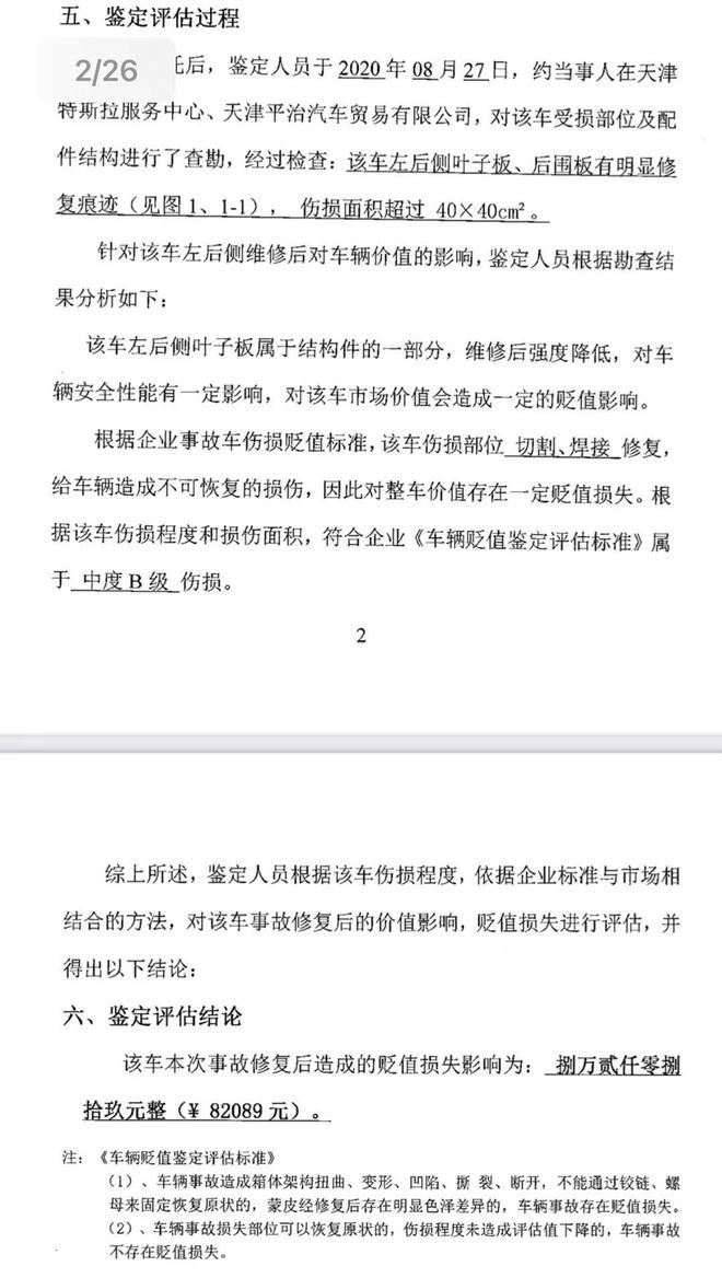 特斯拉方面拒绝认可韩先生单方面提供的《技术鉴定意见书》。经法院组织,双方同意由北京晶实机动车鉴定评估机构有限公司对涉案车辆进行司法鉴定。最终,鉴定意见为,“该车本次事故维修后造成的贬值损失影响为82089元” “该车后叶子板维修后会对车辆安全性造成一定影响。”