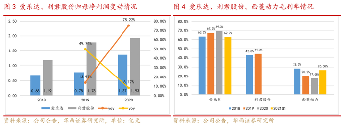 毛利率方面,2018-2020年爱乐达的综合毛利率由63.2%提升至69.3%,2018-2019年利君股份的综合毛利率由42.8%提升至44.3%,均呈现出持续提升态势;2018-2020年西菱动力的综合毛利率持续下滑,主要原因是受传统的汽车零部件业务拖累,2021年第一季度高毛利率的军品业务首次反映在报表中,公司综合毛利率即大幅提升8.90pct至26.58%。