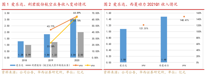 近年来航空零部件制造企业的收入规模持续扩大,2020年和2021年第一季度相关企业持续兑现业绩。专注于军民用飞机零部件精密制造的爱乐达2019年实现收入1.84亿元(+43.77%),2020年实现收入3.04亿元(+64.89%);利君股份的航空航天零件制造业务2019年实现收入1.22亿元(+23.28%),2020年实现收入2.00亿元(+63.78%)。2021年第一季度,爱乐达实现收入1.08亿元(+121.51%),收入增速明显提升,收入规模持续扩大;西菱动力实现收入1.48亿元(+148.41%),主要增长动力源于新增的军民用飞机零部件精密制造业务,公司军工及航空结构件生产线于2020年第四季度建成投产,军工及航空业务产能释放,军品收入大幅增加。