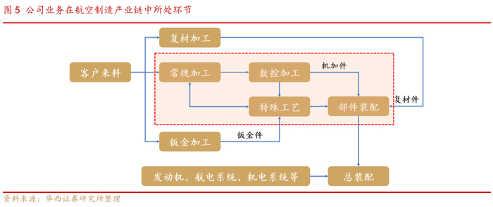 公司专注于航空航天制造领域,主要从事军用飞机、民用飞机零部件、航空发动机零件及航天大型结构件的精密制造,产品包括飞机机头、机身、机翼、尾翼及起落架等各部位相关零部件、发动机零件以及航天大型结构件。公司立足机加龙头优势,不断向产业链下游的特种工艺、部组件装配等环节延伸,目前已具备航空零部件“数控精密机加、特种工艺处理、部组件装配”全流程业务能力。