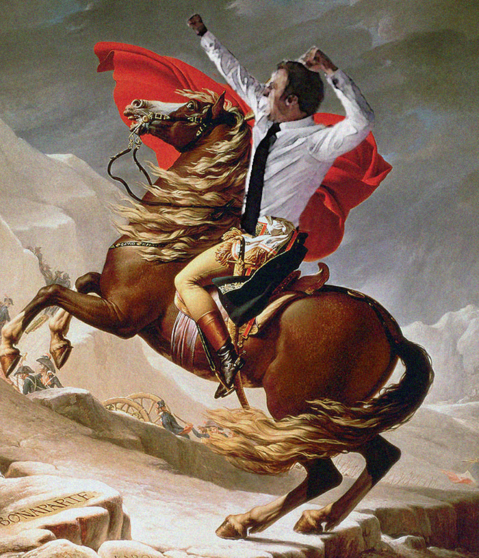 还有人选择把大家带到阿尔卑斯山圣伯纳隘道,看这个男人骑在烈马背上,手指指向高高的山峰,成为新时代的“欧洲雄狮”。