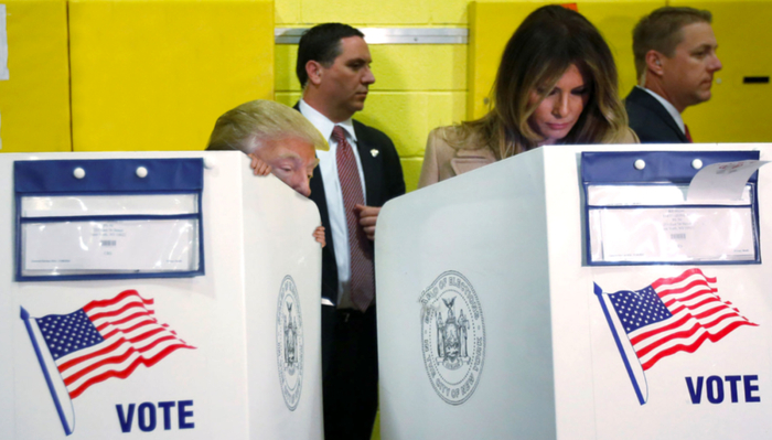 下面是一张曾经在国外网站上疯传的照片,懂王跟妻子在纽约投票,在照片中特朗普似乎在看妻子的选票。