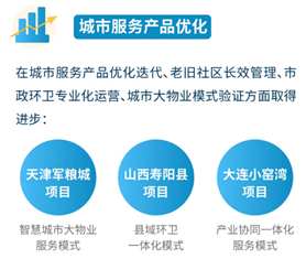 2020年,碧桂园服务在城市服务产品优化迭代、老旧社区长效管理、市政环卫专业化运营、城市大物业模式验证等方面取得进步。以天津军粮城项目为代表的智慧城市大物业服务模式、以山西寿阳县项目为代表的县域环卫一体化模式、以大连小窑湾项目为代表的产业协同一体化服务模式均落地实践,并初具雏形。