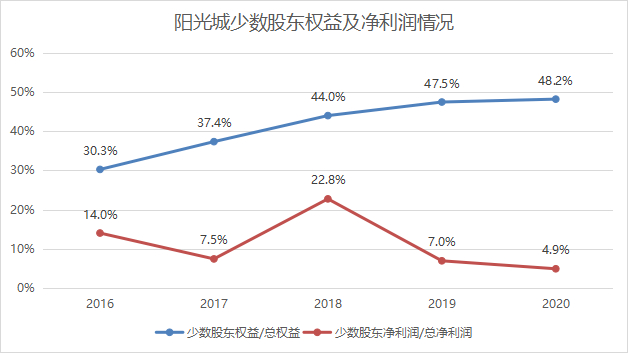 其二,利用少数股东权益。2016年末到2020年末,阳光城少数股东权益分别为57.2亿、114.2亿、180.5亿、241.5亿、285.6亿,持续增长。2020年末,少数股东权益在总权益中占比48%。