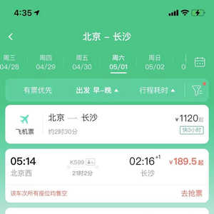 另外,去哪儿网统计,以北京为例,5月1日北京出发至郑州、西安、太原、南京等地方高铁、动车票全部售完,只剩下候补车票。此外广州-长沙、深圳-重庆、西安-成都、武汉-长沙、北京-哈尔滨等主要线路多个车次售罄。