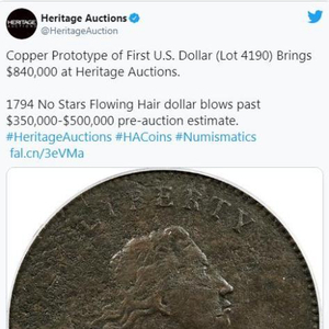 近日,美国一美元硬币原型、1794年由费城造币厂铸造的一枚铜币,拍出84万美元的价格,远高于此前预估。
