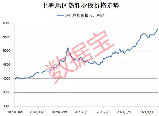 4月26日,铁矿石2109合约收盘报1144.5元/吨,上涨4.33%,螺纹钢2110合约收盘报5371元/吨,上涨2.34%,热轧卷板2110合约收盘报5737元/吨,上涨3.15%,三种期货合约价格均创下成立以来新高,钢材期现货价格同步大涨,延续上周涨势。4月25日上海地区螺纹、热卷现货价格分别涨至5260元/吨、5760元/吨,逼近2008年的历史高位水平,较去年同期分别上涨52%与75%。