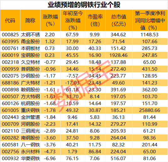 行情上来看,多数业绩预增钢铁股年初至今大幅上涨,平均涨幅29.5%,华菱钢铁上涨76.15%居于第一,其他还有太钢不锈、鞍钢股份累计涨幅超过60%。4月26日钢铁板块股价有所回调,预增股中仅太钢不锈、甬金股份、本钢板材、宝钢股份维持上涨。