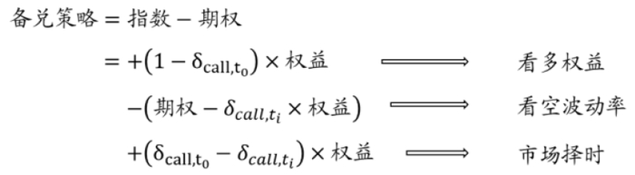 备兑策略风险敞口依照Roni Israelov和Lars N. Nielsen的相关论文,可拆分为看多的权益敞口、看空的波动率敞口和择时风险敞口。首先,卖出的认购期权一定程度降低了组合对于股指 的风险敞口,但同时引入了对于标的股指波动率看空的风险,以及期权delta变动带来的择时风险。简单来说,不能简化认为备兑就是以月频获取期权费作为收入的投资策略。