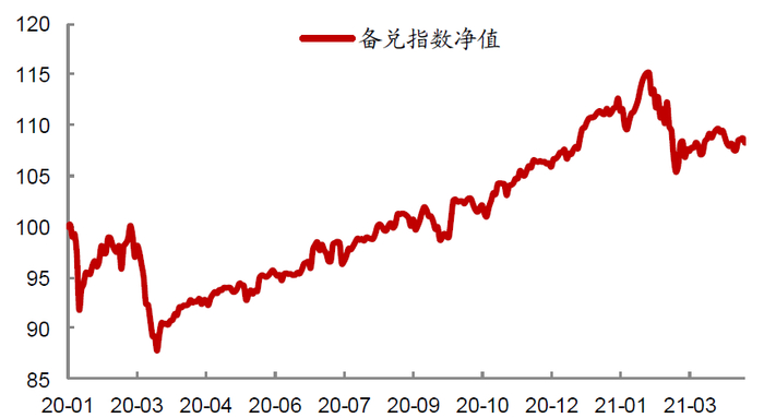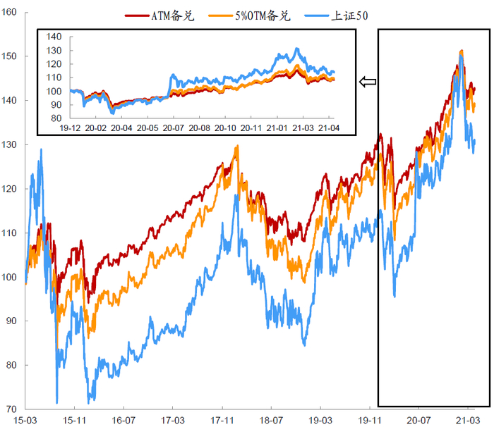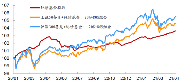 资料来源:万得资讯,中金公司研究部,数据截止2021年4月22日;其中纯债基金指数为万得中长期纯债基金指数,上证50备兑组合和沪深300备兑组合分别由单纯各自单独备兑策略与纯债指数依照20%、80%配制而成