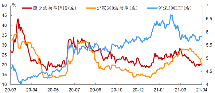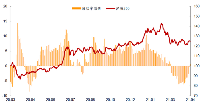 资料来源:万得资讯,中金公司研究部,数据截止2021年4月22日,其中波动率溢价以编制的iVIX与指数近30日日频年化波动率的差值计算,iVIX 为依据CBOE VIX指数计算方式,基于沪深300期权计算得来代表市场股指期权隐含波动率的指标