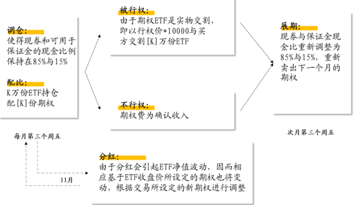 该方案中组合策略每月定期(一般为每月第三个周五)将85%资金配置ETF现券,而将15%资金配置认购期权保证金。(实际操作中,出于预防保证金不足和顾及资金使用效率的考虑,会提高一定保证金配置比例)。以下为策略编制的公式,