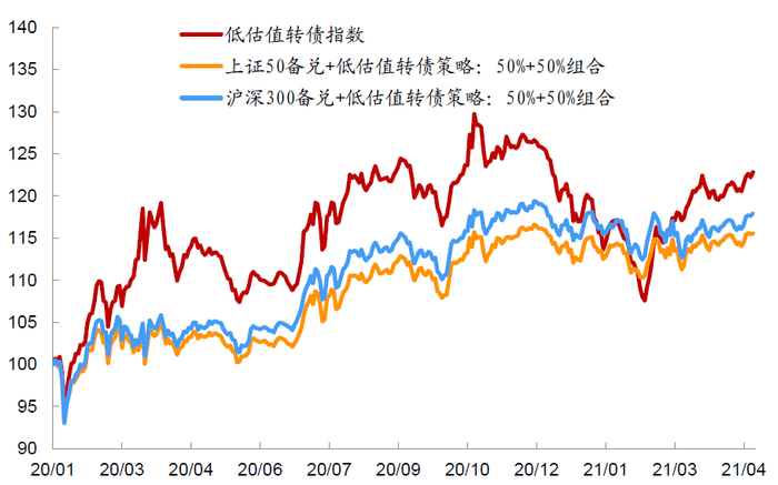 资料来源:万得资讯,中金公司研究部,数据截止2021年4月22日;其中低估值转债指数依照转债价位排名+溢价率排名位于后20%回测而成,上证50备兑组合和沪深300备兑组合分别由单纯各自单独备兑策略与低估值转债依照50%/50%配制而成