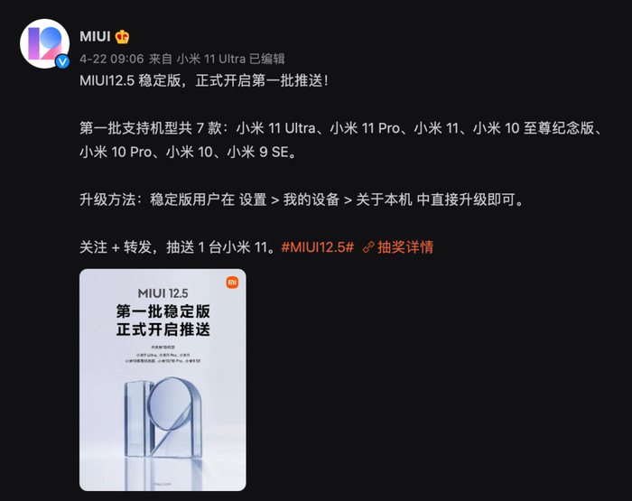 原本计划在 4 月 30 日全量推送的 MIUI 12.5,被提前到了 4 月 22 日,机型也扩充到了 7 款,加上了小米 11 Pro 和小米 11 Ultra 这两部刚发布的“新旗舰”。而 MIUI 12.5 稳定版第二依然暂定为 5 月底,包括红米 K40 系列在内的大部分小米手机型号。