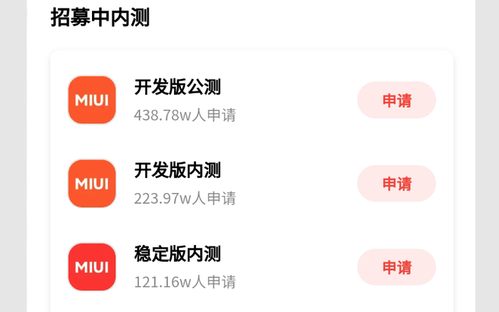 现在的小米社区对于开发版,有着开发版公测、开发版内测、稳定版内测,三个不同版本。申请条件就是需要足够高的“内测分”,不仅仅需要答题,还需要在社区内有着足够的活跃度,并且公测、内测名额是有着官方的限制。另外,当你申请成为内测成员后,这个资格是与你的 MIUI 账号绑定,登出账号后,这个设备的 MIUI 版本号也就停滞了。