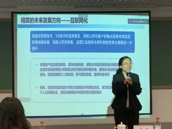 课程伊始,董舒婷向同学们介绍了精算行业的起源与发展、当前精算人员从业领域的基本状况与在不同领域中精算师发挥的作用。她认为,作为综合了数学、统计学、经济学、金融学多学科专业知识的精算师,随着时代发展、专业融合的趋势,其综合优势也在向寿险领域扩展,与经济金融领域深度融合,在寿险及其他相关领域发挥积极作用。