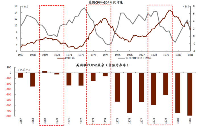 1960年代末,财政政策开始出现“失灵”,凯恩斯主义下的政府支出政策面临挑战。1960年代末开始,美国出现了3次较为典型的“滞胀”,分别在1968-1970、1973-1974、1978-1979年,经济增速回落至负增长,通胀水平则持续抬升。“滞胀”格局下,凯恩斯主义的财政政策面临两难。财政扩张拉动经济的同时会助推通胀;伴随通胀抬升,财政、货币等宏观政策不得不相应收缩、来控制通胀。3次“滞胀”期间,财政空间都受到一定制约,加大经济下行压力。