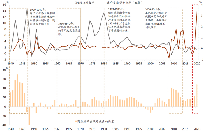 大财政对宏观经济和资本市场的含义何在?一个直接的含义恐怕是通胀波动增加,低通胀时代一去不复返,通胀中枢较疫情之前上升。一般而言,货币扩张比较容易推升资产价格,而财政扩张更倾向于带来实体通胀。此外,这轮财政扩张相当程度上由美联储配合,美联储持有美债的比例明显上升,从2019年4季度13.1%大幅上升至2020年4季度21.3%。在货币配合财政的情况下,市场尤其担心“财政支出货币化”会否带来恶性通胀的问题。需要指出的是,财政支出货币化并没有一个非常严格的定义,我们此处简单地用中央银行持有的政府债务增量与财政支出之比来量化这个概念。有研究对跨国历史数据进行的总结表明,财政赤字与政府支出的比例超过20%,以及(或者)财政赤字占GDP的比重超过30%,常会触发恶性通胀[23]。我们梳理了1940年以来,美国财政赤字、财政支出的货币化程度、以及通胀的变化,发现较高的财政赤字或者政府支出货币化是通胀压力上升的必要条件,但不是充分条件。