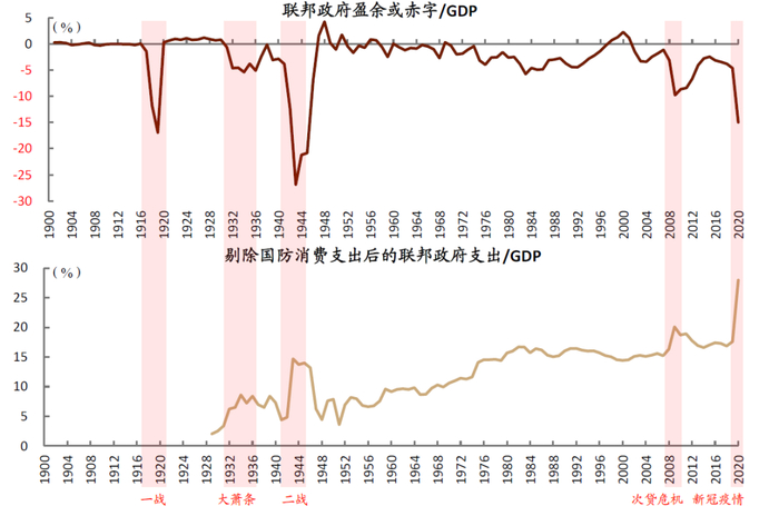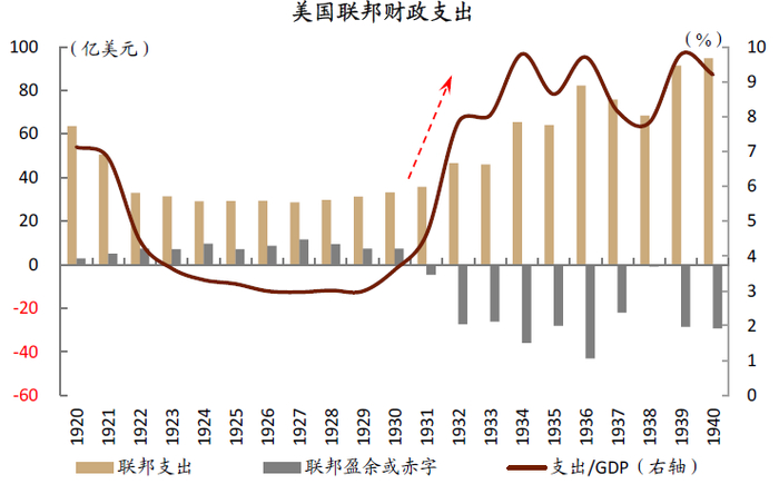 在预算平衡的“小政府”下,国防开支是早期财政支出大幅扩张的主要原因。1830-1930年代这100年间,美国政府出现过2次杠杆率的大幅跳升(均达到30%以上),分别是1860年代南北战争时期,以及1910年代末的第一次世界大战。大规模的国防支出,以及战后需求释放,通常都会拉动复苏(比如第一次世界大战后“咆哮的二十年代”)。在“小政府”时期,国防开支一定程度上扮演了财政扩张的角色。