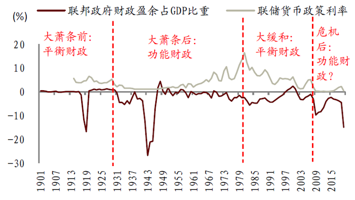1930年代之前,平衡财政。当时的宏观经济失衡主要体现为资产泡沫、金融危机和贫富分化。1929年,美国股市崩盘,资产泡沫破裂,引发金融危机,导致经济大萧条。此时的宏观政策思维被古典经济学主导,注重自由市场、金融混业经营,财政政策思维方面则恪守平衡财政,除了第一次世界大战期间,财政赤字率大致保持在零附近。