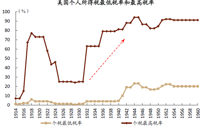1933年罗斯福执政后实行“新政”(New Deal),首次在美国经济实践中推行凯恩斯主义,通过大规模政府开支提振经济。“新政”发挥了功能型财政的作用,积极扩大财政支出,设立了一批“字母机构”,包括工作进度管理局(WPA)、联邦紧急救援局(FERA)等,专门执行以工代赈、扩大基建投资等职能。并通过《社会保障法》建立了社会保障体系,首次通过收缴居民部分收入,来支付居民未来的养老等社保支出[10]。同时,运用税收手段提高财政收入,大幅提高高收入者的个人所得税,增加遗产税、房产税上限等。财政支出占GDP比重从1929年的3%升至1934年的9.8%,其中1934年财政支出较1933年大幅增长了42.3%。