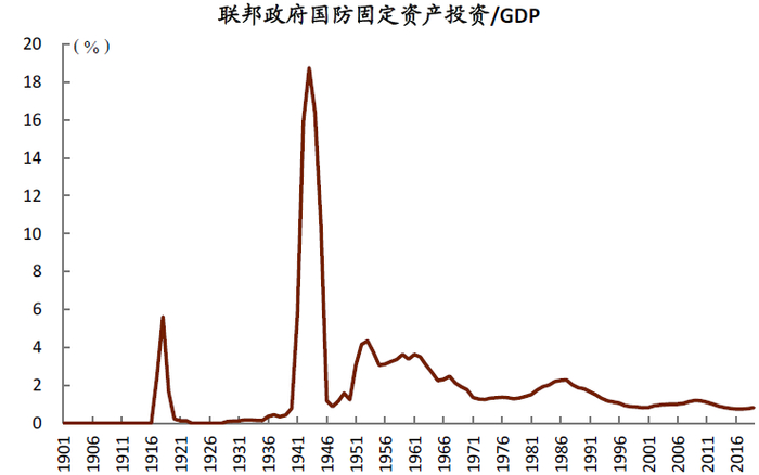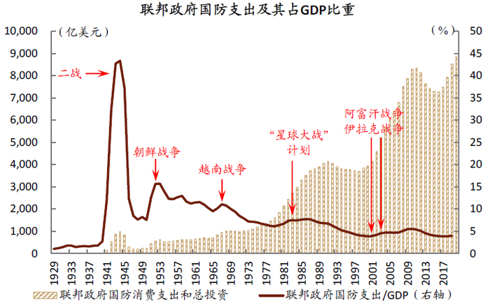 1940年代二战期间,国防开支成为了美国联邦财政支出的重要构成部分。在二战期间,国防支出(包括消费和投资)占到了美国当时GDP的40%以上。大规模的政府开支及国防订单,让美国走出“大萧条”阴影。战后国防开支并未回到战前的低水平(1929-1939年,美国国防支出占GDP比重仅为1.5%),反而成为了政府支出的重要构成,1941-1970年,联邦政府的平均国防支出强度[15]高达12.7%。