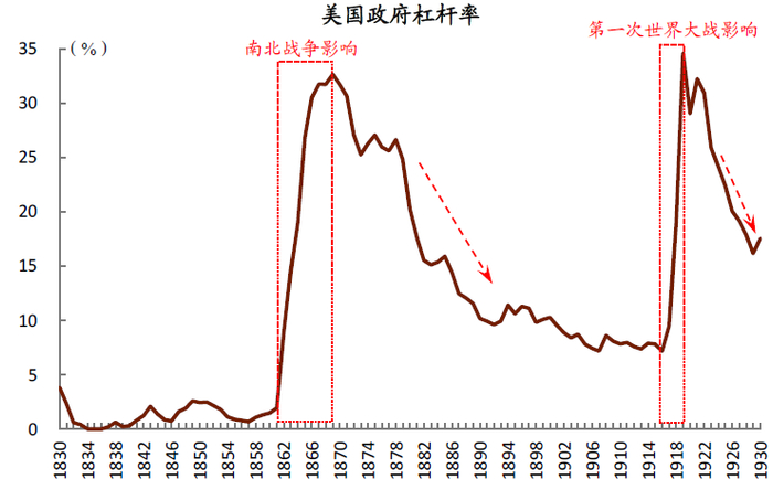 联邦政府从成立之初,便呈现鲜明的“小政府”特征,除了战争期间的支出扰动,其余时间恪守财政平衡。南北战争之前,政府杠杆率一度接近0;南北战争后到20世纪初,政府依然实行较严格的财政预算控制政策,杠杆率持续下降。第一次世界大战带来了阶段性的财政扩张,战后财政又迅速重归平衡。从1920年起,美国联邦政府连续11年财政盈余、偿还战争债务,政府杠杆率也从一战时期的近35%,快速回落至20%以下。
