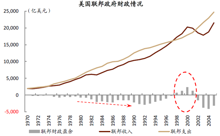 1990年代,克林顿政府加税减支、控制赤字,到1990年代末甚至实现了短暂的财政盈余。为了缓解财政平衡压力,老布什政府从1990年代初开始加税。继任的克林顿政府则进一步削减赤字,1993年《综合预算和解法案》提出系列增加税收和减少支出举措,期望在1997年之前将赤字减少一半。得益于有效的财政约束和良好的经济形势,联邦政府财政状况好转,在1998-2001年出现了连续4年财政盈余。