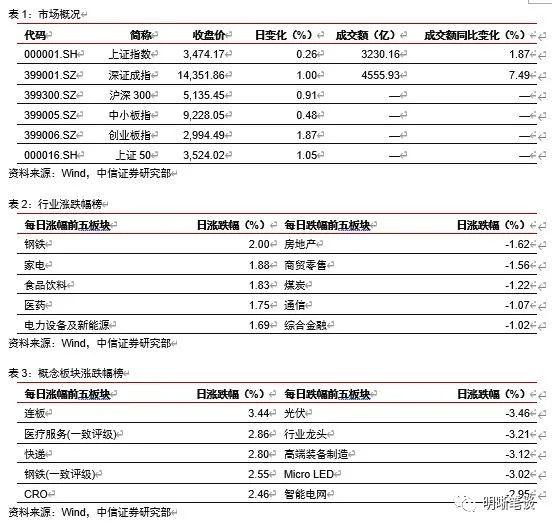 2021年4月25日,银存间质押式回购加权利率大体上行,隔夜、7天、14天、21天和1个月分别变动了6.01bps、7.97bps、8.54bps、15.98bps和5.61bps至2.02%、2.18%、2.37%、2.46%和2.44%。国债到期收益率大体上行,1年、3年、5年、10年分别变动-0.42bp、0.50bp、1.57bps、1.22bps至2.39%、2.75%、2.98%、3.18%。4月23日上证综指上涨0.26 %至3474.17,深证成指上涨1.00%至14351.86,创业板指上涨1.87%至2994.49。
