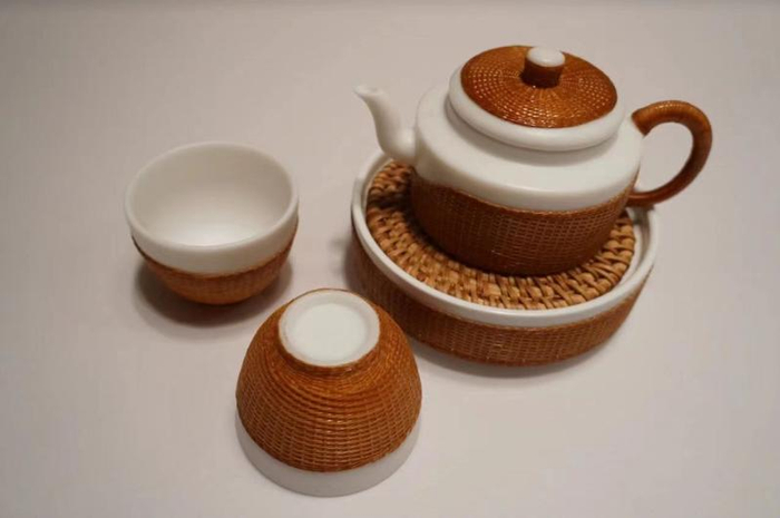 (贵州赤水藤编 杨昌芹作品《精细竹丝扣瓷茶具》)