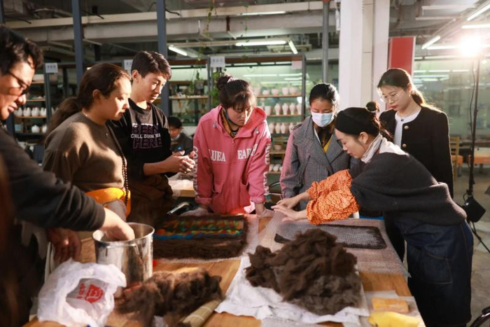 PACC公共教育主管郑珊珊拿出一张课程表,上面既有牦牛绒产品制作这样的实践课,也有《平面构成》《色彩的故事》《装饰图案基础》这样的基础课;有《非遗传统与设计衍生》《传统手工艺的时尚实践》这样的专题讲座,也有参观宜家工厂、江苏张家港牦牛绒制作企业(下图)这样的考察课程。除此之外,学员们还参与了在顾村公园举办的樱花节非遗体验公共交流活动,与上海市民面对面。