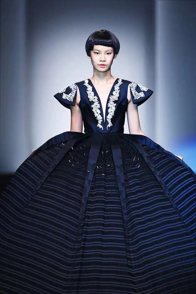 海派旗袍设计师苗海燕和鞋履设计师张金玹,牵手缂丝传承人郝乃强,推出包括缂丝高定礼服、旗袍及女鞋的“桃花源”系列,古代皇家御用的缂丝技艺在现代复活出了青绿山水的中式美学;时装设计师秦旭牵手“90后”羌绣传承人张居悦,以羌绣独有的十字绣针法和图案完成了一件名为“大山之托”的黑色法式礼服(下图)。而这件耗费团队两个月的心血之作确实不负重托,走出大山,登上了法国时装设计周的舞台,让全世界看到了中国非遗之美。