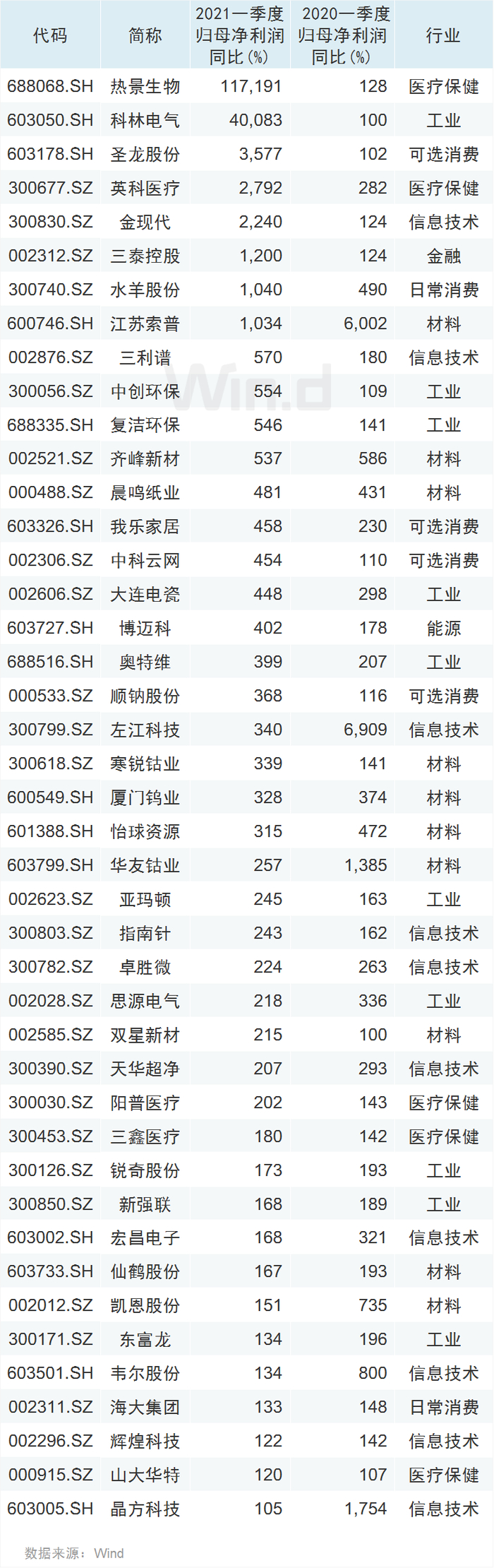 从一季度业绩表现来看,有43家公司2020年一季度和2021年一季度业绩增幅均超过100%。其中,热景生物、科林电气、圣龙股份、英科医疗、金现代、三泰控股、水羊股份、江苏索普等公司2021年一季度业绩增幅超过10倍。