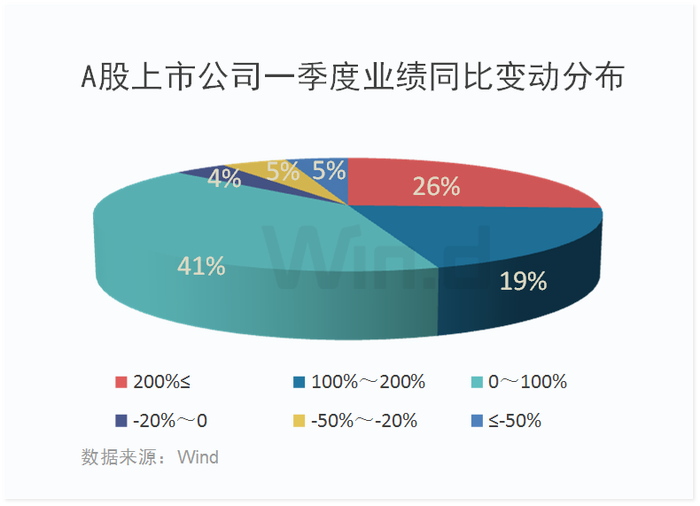 随着上市公司一季度业绩浮出水面,部分高成长公司亦崭露头角。Wind数据显示,截至目前,已有1000多家公司披露了一季报,从相关公司业绩表现来看,绝大多数公司取得较大增长,即使考虑到2020年一季度较低的基数,高增速公司数量依旧占比较大。具体来看,一季度归母净利润增幅超过200%的公司有262家,占比26%;增幅在100%—200%之间的公司有197家,占比19%;增幅在100%以内的公司有421家,占比41%;增幅为负的仅138家,占比14%。