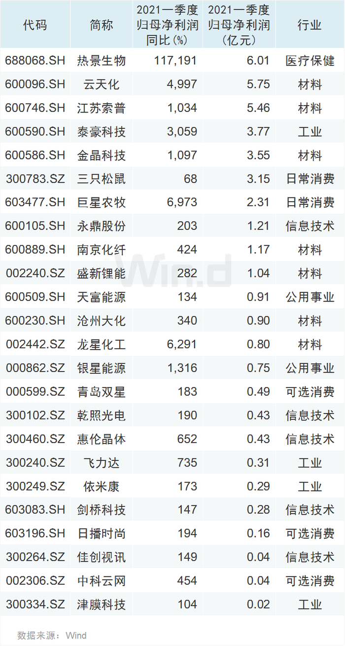 从单季度业绩表现来看,有24家公司2021年一季度归母净利润创2019 年以来最好水平,其中,热景生物、云天化、江苏索普、泰豪科技、金晶科技、三只松鼠、巨星农牧、永鼎股份、南京化纤、盛新锂能今年一季度归母净利润均超过1亿元。除三只松鼠外,其余公司一季度业绩增幅均超过100%。