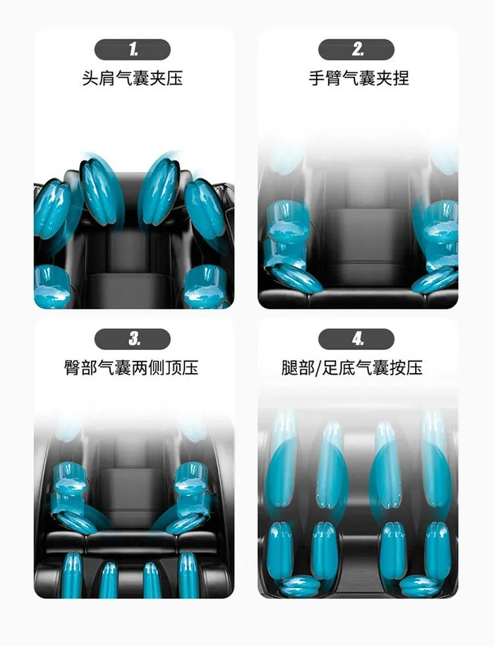 臀部气囊+震动,头部设有气囊,肩部气囊、手臂气囊、腿部设有气囊,小腿部各设有四个气囊。