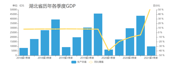 2021年一季度湖北GDP同比增长58.3%,一扭去年疫情冲击经济停摆的颓势,体现出非同一般的复苏效应。