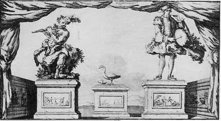 他一共制作过三个最有名的自动机械装置 :吹长笛的人,打手鼓的人和消化鸭(The Flute Player, The Tambourine Player, and Digesting Duck),可惜都已不存。