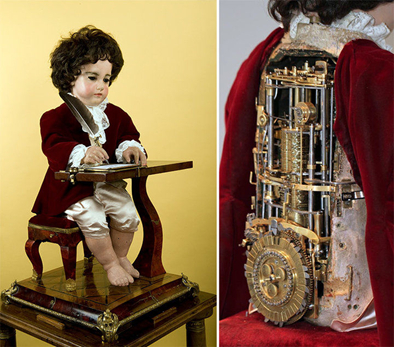其中写字男孩是三个中最复杂的,至今还可以运转。通过更换男孩背部的凸轮组合,男孩可以写出各种不同文字,在写字的过程中,男孩的眼睛还会随着书写转动。如今,他已经被认为是电脑的始祖,写字男孩也可以被看作成初代程序员。