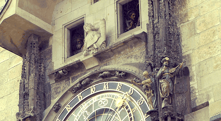 比如一整点报时,天文钟上面的小骷髅拉响铃声,十二尊耶酥门徒从钟旁依次现身,六个向左转,六个向右转,随着雄鸡的振翅啼鸣,窗子关闭,塔楼上的报时钟声响起。