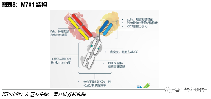 (1)M701为带Fc端的全长完整抗体,半衰期长,无须频繁给药。通过点突变彻底去除Fc端介导的ADCC作用,免疫原性较低;