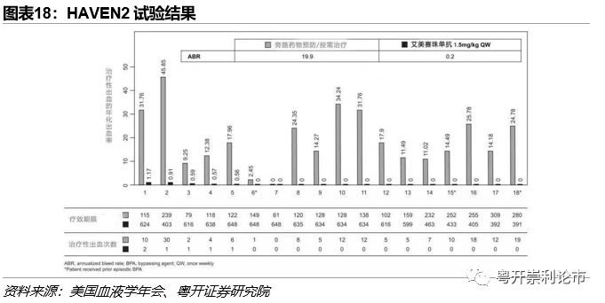 Haven2研究中有18名患者既往接受旁路药物预防(n=15)或按需治疗(n=3),其年化出血率达19.9,且出血控制并不满意。这些患者后续转至Hemlibra,预防治疗后出血风险下降达99%,年化出血率仅0.2,其中13名患者未发生任何治疗性出血事件。