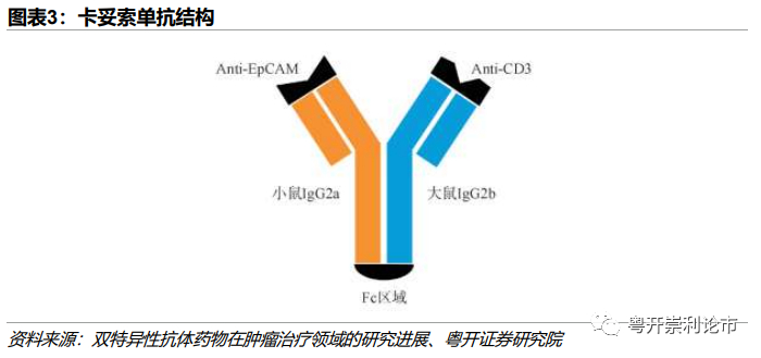 作用机制:卡妥索单抗是由靶向两种抗原的抗原结合臂与招募免疫细胞Fc区组成的三功能特异性抗体(Trifunctional Antibodies)。一条抗原结合臂特异性结合肿瘤细胞上高表达的跨膜糖蛋白EpCAM,另一条抗原结合臂特异性结合T细胞上的CD3,Fc区可与巨噬细胞、NK细胞等免疫细胞上的Fc受体结合并激活其免疫功能。总的来说,卡妥索单抗通过招募T细胞裂解靶细胞,并利用抗体依赖性细胞介导的细胞毒性以及细胞因子介导的细胞毒性共同实现抗肿瘤作用。