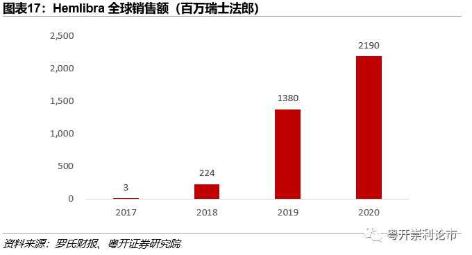 市场表现:2020年,Hemlibra全球销售额达21.9亿瑞士法郎,成为首个销售额进入全球TOP100的双特异性抗体药物,这一优异的成绩源于“不含Ⅷ因子抑制物的A型血友病”适应症的获批上市,该适应症大幅拓宽了Hemlibra的使用范围。但是,Hemlibra由于售价过高,或对其国内市场推广造成限制,国内目前售价为8100元/30mg。2020年,艾美赛珠单抗参与医保谈判,但由于价格的因素未纳入2020年医保目录。