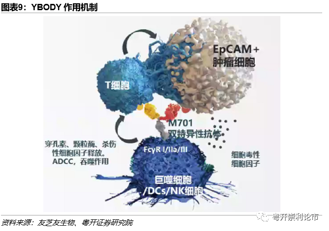 技术平台:M701是基于YBODY技术平台研发的双抗药物。YBODY平台形成的异源二聚体其中一条为正常重链,另一条为Fc功能区的N端连接的scFv。采用YBODY结构的抗体正常重链端能够结合肿瘤细胞表面蛋白,scFv端能够结合T细胞CD3分子,与CD3的结合可激活T细胞,并将T细胞靶向肿瘤细胞,增强杀伤效果。