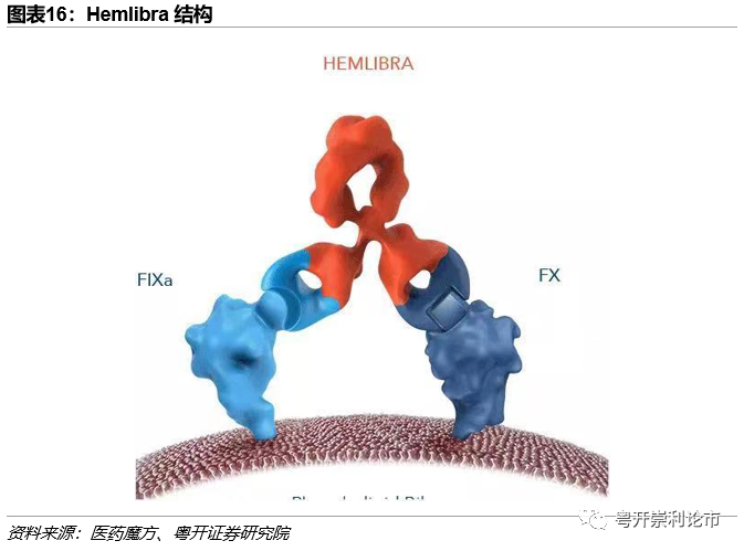 艾美赛珠单抗由罗氏研发,是一种重组人源化的IgG4双特异性单克隆抗体,通过重组DNA技术在中国仓鼠卵巢(CHO)细胞中制备。Hemlibra通过桥接FIXa和FX,促进凝血酶的生成,恢复A型血友病患者的凝血过程,使FⅧ功能障碍或完全缺乏FⅧ的A型血友病患者的出血部位达到止血。