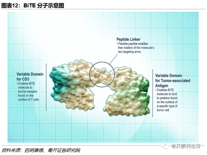 设计平台:Blincyto为基于双特异性T细胞衔接系统(BiTE平台)研发的双抗药物。BiTE是一种串联型的scFv,由于不含Fc结构,分子量较小,渗透性高,可以到达大分子抗体难以抵达的部位与抗原发生结合。但是由于不存在Fc端介导的FcRN再循环机制,半衰期较短。Blincyto半衰期约为2小时,需要较为频繁的给药。