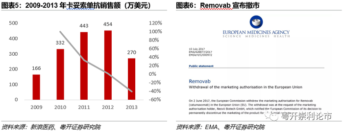 市场表现:自2009年上市后,Removab市场表现并不乐观,2012年峰值销售额仅454万美元,出于商业原因,Removab于2014年停止于市场销售,最终于2017年6月官宣退市。