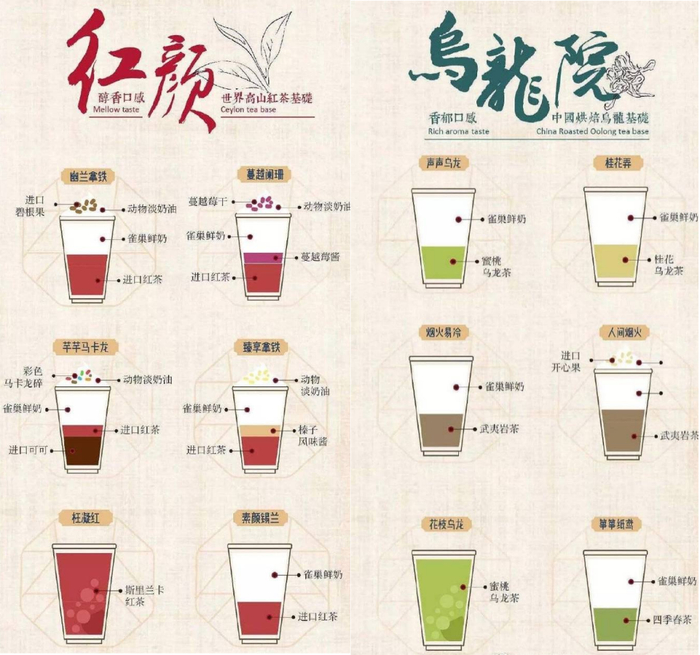 第一代饮品的名字也贯彻了雅致的中国风,灵感多来自于词牌名和古典文学。“蔓越阑珊”取自辛弃疾《青玉案·元夕》中的名句“蓦然回首,那人却在,灯火阑珊处”。“声声乌龙”则是受到《声声慢》的启发。在茶颜员工的眼里,这款乌龙茶打底的奶茶就像是林徽因、吕碧城这样的“中国闺秀”。
